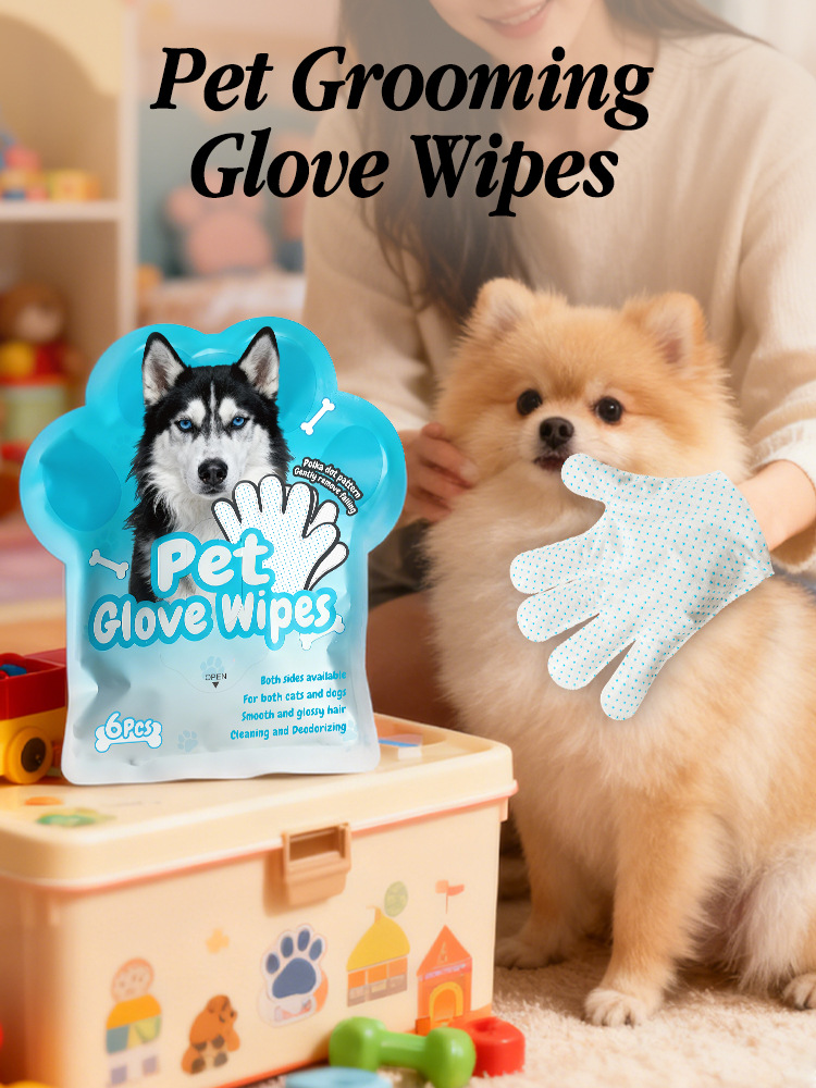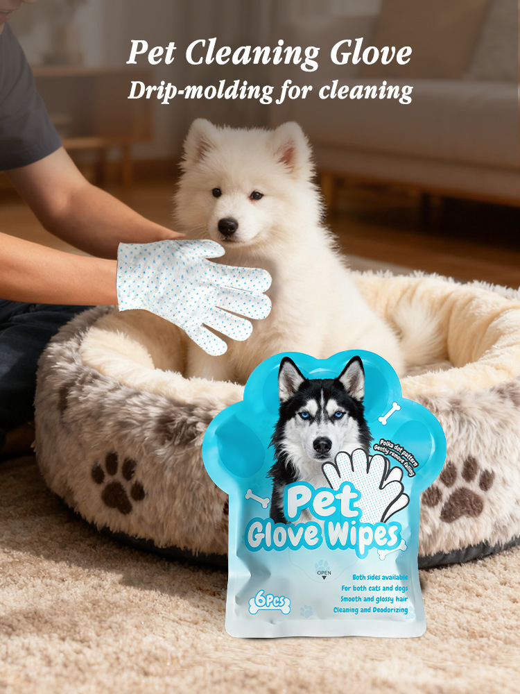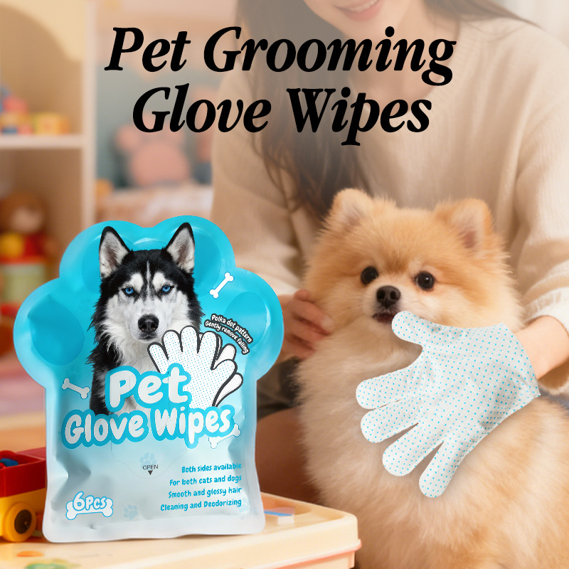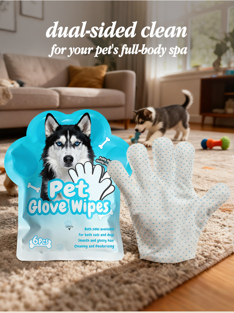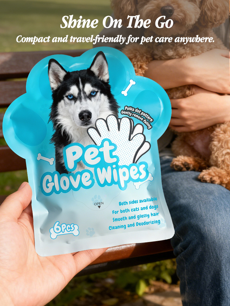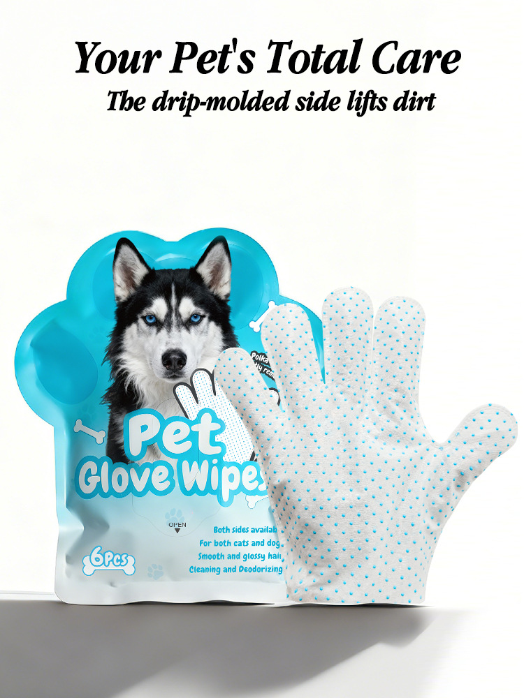 5-Finger Drip-Molded Pet Grooming Glove Wipes (6 Pcs/Bag) – Disposable No-Rinse Cleaning Gloves for Dogs & Cats, Dual-Sided Deodorizing & Moisturizing Pet Wipes
